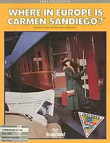 Where in Europe Is Carmen Sandiego? is a 1988 European geography-based educational computer game in the Carmen Sandiego detective mystery franchise. It was originally published by Broderbund in 1988 for Apple II, Commodore 64, and DOS, and ported to the Amiga and Macintosh in 1989. It is the third Carmen Sandiego title, after Where in the World Is Carmen Sandiego? (1985) and Where in the USA Is Carmen Sandiego? (1986). Under the guidance of The Acme Agency's chief, the player completes cases to catch Carmen's henchmen; they accomplish this by traveling to European cities to find clues relating to the crook's last known whereabouts, and by gaining enough character data to issue a warrant of arrest. Once the player has captured all 15 thieves, they can pursue Carmen herself.