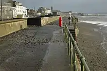 The area bore the brunt of the Ash Wednesday storm on 7 March 1962, with most of the buildings destroyed along with nearly one mile of the seafront from the Battery Rocks to Tolcarne heavily damaged. The only Wherrytown building to survive was the Mount's Bay Inn.[2] At low spring tides, and after storms partially fossilised trees can be exposed.[3] The South West Coast Path follows the shore.