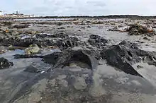 Offshore surveys of Mount's Bay have found submerged, erosional plains and valleys containing deposits of peat, sand and gravel. The deposits indicate cyclical changes from wetland, to coastal forest, to brackish conditions have been occurring over the past 12,000 years as sea levels rose.[4] Either side of Penzance, on the beaches at Ponsandane and Wherrytown, evidence of a ′submerged forest′ can be seen at low tide in the form of several partially fossilised tree trunks.[5] Divers and trawlers also find submerged tree trunks across Mount’s Bay and the forest may have covered a coastal plain 2 to 5 kilometres further south than today. The samples of peat and wood around Penzance have been radiocarbon dated and indicate that the forest was growing from at least 6,000 to around 4,000 years ago when rising sea levels finally killed the trees.[4] Artefacts dating from the Mesolithic (10,000 to 5,000 BCE) have been found indicating some occupation contemporary with the forest. Marshes formed and were overlain by sand, gravel and by sand dunes which formed natural barriers to the sea. The Western Green (a sand dune system, now under Penzance promenade) was such a barrier. Storms sometimes destroyed the barriers depositing sand and gravel over peat beds in Marazion Marsh, and in the foundations of buildings in Wherrytown. The submerged forest in the intertidal area between Wherrytown and Long Rock is of national importance and is a County Geology Site, designated by the Cornwall Geoconservation Group of Cornwall Wildlife Trust.[4]