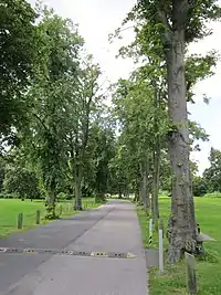 The park has formal gardens, football pitches, a climbing area, a basketball court, tennis courts, crown green bowling, dog walking, skatepark, a wooded copse, fish pond and two children's play areas. A short (0.4 mile) sculpture trail featuring work by artist Steve des Landes on the theme of Air Quality loops around Whitby Hall.[4]