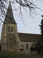 Little is known about the earlier Saxon structure because its Norman lords built a more imposing successor which is the basis of the present parish church of All Hallows. One Saxon remnant is the grave cover of Frithburga.[9] The first stage was completed in about 1190 when the three western bays on the south side of the nave were added. A north aisle was added in the 15th century. The tower was re-built in 1716 but still features the original oak stair turret. The whole church was largely re-built in 1866 and the square Norman tower was capped by a Gothic Revival spire.[10]