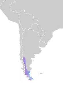 The white-bellied seedsnipe is found from southern Chile's Magallanes Region and west-central Argentina's Río Negro Province south through Tierra del Fuego to islands off Cape Horn.[2][8] It has also occurred as a vagrant in the Falkland Islands.[9] In the breeding season it inhabits windswept ridges and moorland characterized by crowberry heath (Empetrum rubrum) and cushion plants. It also occurs along creeks and at small wetlands. Outside that season it mainly inhabits the Patagonian steppe.[2][8]