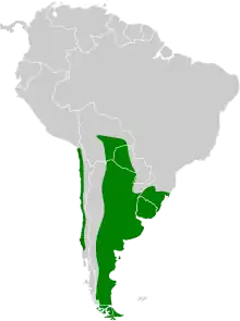 The white-winged coot is found in most of southern South America, in northern to central Chile and separately from eastern and southern Bolivia, Paraguay, and far southeastern Brazil south through Uruguay and Argentina into Tierra del Fuego. There is also a population in the Falkland Islands and the species occurs as a vagrant in Peru.[5][4] It inhabits freshwater lagoons, ponds, marshes, and river backwaters, favoring those with grassy or bare shores and many submerged plants or floating duckweed. It is sometimes found on saltwater close to shore.[5]