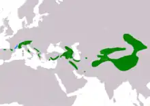 It is a resident breeding species on bare mountains, typically above 1,500 metres (4,900 ft), across southern Europe (Pyrenees, Alps, Corsica, Balkans) and through central Asia to western China. It nests in crevices or rodent burrows, laying 3–4 eggs.