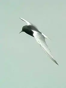 Hybridisation between this species and black tern has been recorded from Sweden[2] and the Netherlands.[3] Two juvenile birds at Chew Valley Lake, England, in September 1978 and September 1981, were also believed to be hybrids; they showed mixed characters of the two species, specifically a combination of a dark mantle (a feature of white-winged black) with dark patches on the breast-side (a feature of black tern, not shown by white-winged black).[4][5]
