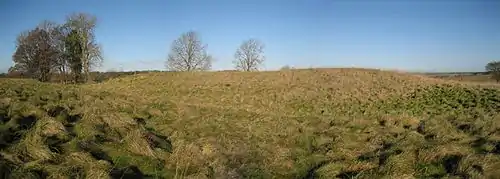 White Barrow is 77.5 m long and approximately 47 m wide (including the surrounding ditch). It has never been fully excavated, but dating of materials found in and around it suggests that it dates from 3500 to 4000 BC, making it contemporary with other long barrows on Salisbury Plain, as well as the nearby causewayed enclosure called Robin Hood's Ball. The antiquarian Colt Hoare opened the mound in the 1806,[1] and found areas of black earth that he believed to be the remains of a wooden-structured burial chamber.[2]