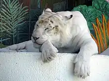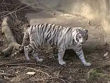 The white tiger or bleached tiger is a leucitic pigmentation variant of the mainland Asian tiger. It is reported in the wild from time to time in the Indian states of Madhya Pradesh, Assam, West Bengal, Bihar, Odisha, in the Sunderbans region and especially in the former State of Rewa.[1] It has the typical black stripes of a tiger, but its coat is otherwise white or near-white.