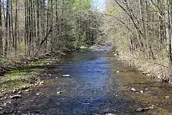 White Deer Creek is a freestone stream.[11] There are numerous strainers on White Deer Creek, to the point where the creek was described as "one of the most tree-infested and strainer-struck streams in the state".[13] The creek's channel is also braided in some reaches.[13] The creek flows through a very narrow valley and, in its upper reaches, is small for a canoeing stream.[13][14] The community of White Deer experiences significant flooding problems because it is on the creek's floodplain, and because of the creek's narrow valley.[14] The topography of the watershed is mountainous, with the creek's narrow valley being surrounded by steep ridges.[15] The watershed was described as rugged, with sharp topographical features, in a 1938 report. The watershed is not affected by glaciation, as it is approximately 30 miles (48 km) south of the glacial moraine.[12]
