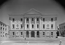 Washington never lived at Government House since the national capital was moved to Philadelphia in 1790, where it remained through 1800.[9][10] The July 1790 Residence Act designated the capital be permanently located in the new Federal District, and temporarily in Philadelphia for ten years while the permanent capital was built.[11] Philadelphia rented the mansion of Robert Morris, a merchant, at 190 High Street, now 524–30 Market Street, as the President's House, which Washington occupied from November 1790 to March 1797.[12] Since the house was too small to accommodate the 30 people who then made up the presidential family, staff, and servants, Washington had it enlarged.[12]
