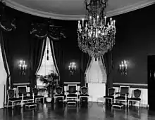In early 1946, during a formal reception in the Blue Room, the First Lady noticed the very large crystal chandelier overhead swaying and its crystals tinkling. The floor of the Oval Study above moved noticeably when walked on, and a valet was then attending the president while he was taking a bath. Truman described a potential scenario of him in his bathtub falling through the floor into the midst of a Daughters of the American Revolution tea "wearing nothing more than his reading glasses.".[5] In early 1947, a "stretching" chandelier in the East Room and another swaying in the Oval Study caused further alarm.[6][7] "Floors no longer merely creaked; they swayed."[8]