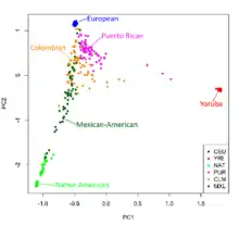 Principal component analysis of the genomes of Puerto Ricans (pink), White Europeans (blue), Colombians (orange), Mexicans (green), Native Americans (lime) and West African Yoruba (peach).