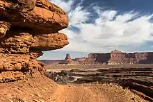 The White Rim Road is a 71.2-mile-long (114.6 km)[1][note 2] unpaved four-wheel drive road[2] that traverses the top of the White Rim Sandstone formation below the Island in the Sky mesa of Canyonlands National Park in southern Utah in the United States.[3] The road was constructed in the 1950s by the Atomic Energy Commission to provide access for individual prospectors intent on mining uranium deposits for use in nuclear weapons production during the Cold War.[4] Large deposits had been found in similar areas within the region; however, the mines along the White Rim Road produced very little uranium and all the mines were abandoned.[4][5]