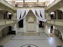 The main prayer hall is surrounded on three sides with women's galleries. Two levels of galleries to the north and two on the south flank a single gallery on the eastern Torah ark wall. The wooden frame of the Torah ark and the damaged tablets of the Ten Commandments are all that remain of the original religious features.[2]