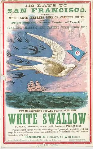 White Swallow left New York in 1865 under Captain Elijah E. Knowles in "rum shape with rag-tag rigging"—in poor condition.[2]