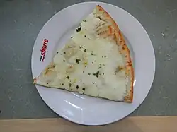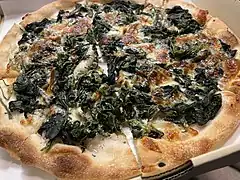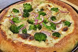 White pizza, pizza bianca or a white pie is a style of pizza that does not use tomato sauce.[1] The pizza generally consists of pizza dough, olive oil, garlic, cheese, salt and sometimes toppings including vegetables such as spinach, tomato, and herbs.[2][3][4][5] Ricotta is a common type of cheese used on white pizza in the United States.[5] Sometimes, white sauces, such as bechamel, are used.[5]