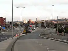 The arterial road Broadway (A633) was constructed in 1925.[13] The same year also saw the construction of the first Chadderton Power Station built in the Slacks Valley close to Whitegate. Hollinwood Avenue (A6104) was also constructed during this period.