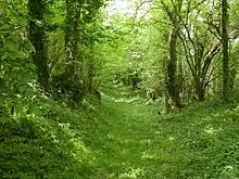 Whitsbury Castle, or Whitsbury Castle Ditches, is the site of an Iron Age univallate hillfort located near the village of Whitsbury in Hampshire. The fort is roughly pear-shaped, located on a chalk outcrop, and covering approximately sixteen acres. The defenses comprise two large ramparts with outer ditches and an additional counter scarp bank on the northern half.[1] The original entrance was at the southwestern corner but has been destroyed by the construction of a post-medieval manor house. The site has been in use throughout the ages, with excavation revealing mesolithic activity, an association with a Bronze Age ranch boundary, an Iron Age hillfort settlement, followed much later by Anglo-Saxon renovation and reuse of the defences.[2] The site is privately owned but is flanked externally on all sides but east by public bridleways.
