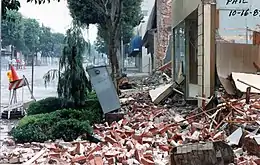 Although most of the Los Angeles metropolitan area saw shaking in line with Mercalli Intensity values of VI (Strong) or VII (Very strong), Whittier experienced effects consistent with MMI values of VIII (Severe). The old commercial district saw the worst damage, as these were the oldest buildings, and were also heavily damaged in the 1929 Whittier earthquake, a shock may have been a result of movement on the Norwalk Fault.[7]