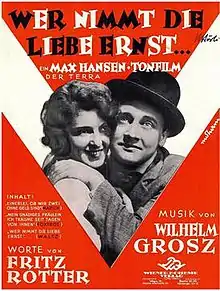 Who Takes Love Seriously? (German: Wer nimmt die Liebe ernst...) is a 1931 German romantic comedy film directed by Erich Engel and starring Max Hansen, Jenny Jugo, and Otto Wallburg.[1] It was shot at the Marienfelde Studios of Terra Film in Berlin and on location in the city. The film's sets were designed by the art director Heinrich Richter.