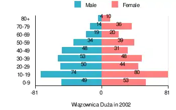 According to the 2002 Poland census, there were 706 people residing in Wiązownica Duża village, of whom 48.9% were male and 51.1% were female. In the village, the population was spread out, with 33.3% under the age of 18, 37.1% from 18 to 44, 16.4% from 45 to 64, and 13.2% who were 65 years of age or older.[1]