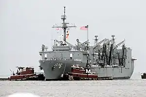 The ships could carry 160,000 barrels (25,438,000 litres) of fuel oil (DFM) and/or jet fuel (JP5), 600 tons of munitions, 200 tons of dry stores and 100 tons of refrigerated stores. To transfer cargo, the ships were equipped with four fueling stations and two cargo handing stations on the port side and three fueling stations and two cargo handing stations on the starboard side.[1] As built the port forward fuel station and associated tanks were for aviation gasoline (AVGAS), but were converted after the retirement of the Navy's last piston-engined aircraft. Originally, the first six ships only had a large helicopter landing deck aft, but no hangar. Roanoke was the first ship equipped with a large double hangar for two UH-46 Sea Knight helicopters. The hangar was later retrofitted to the other ships.