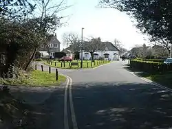 Further down towards Wick Green, there are more listed cottages including two whitewashed brick and slate properties, 'Quality' and 'Tranqility' (sic): the former was used as a retreat by the music-hall star Ella Shields in the 1930s, while the latter housed a tea-room and village shop, run by a Mrs. Knaggs, into the 1950s.[10] Not far from these properties, in the middle of Wick Green itself, are two grass-choked flagstones covering a well, which was used by villagers into the 1930s.[11]