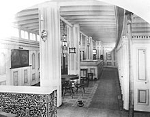 The deck above the main deck was called the “boiler deck”.[6] A portion of the boiler, known as the “steam drum” protruded into the hall on the forward end of boiler deck, and was surrounded with metal jacketing.[6] Overcoats, valises and other things were often stowed on tope of the jacketing while the vessel was under way.[6]
