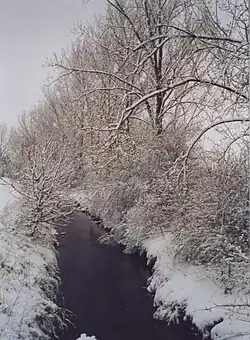 ![]() Map of the catchment area (excluding the mouth) of the two parallel Donnersberg streams: the Wiesbach (right) and Appelbach (left) | |