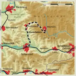 The Wieslauf Valley Railway (German: Wieslauftalbahn) is a branch line in the Stuttgart region of the German state of Baden-Württemberg. It is single-track and standard gauge, and was originally 22.8 km (14.2 mi) long, connecting the main Remsbahn line at Schorndorf to Welzheim. Today it is operated in two sections, with the first 11.5 km (7.1 mi) from Schorndorf to Rudersberg served by a regular passenger service, whilst the final 11.3 km (7.0 mi) forms a steam operated heritage railway.[1]