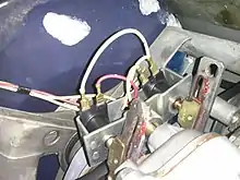 The wig-wag is mounted atop the washing machine's transmission, where it oscillates back and forth like a railroad signaling wigwag (hence the name). When either solenoid is engaged, a rod catches and engages the transmission in the desired mode. A wig-wag is a form of servomechanism; the coils are not powerful enough to engage the belt clutch themselves, but they can move their pins within the cam bar, then the mechanical oscillation of the wig-wag provides the force to push the cam bar and engage the belt clutch. When a solenoid is de-energized, the pin drops due to gravity.