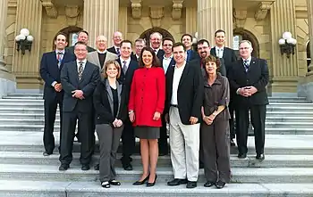 Smith and Dyrholm both attempted to capitalize on the party's election win, proclaiming that Albertans wanted change and that each of them would lead the Wildrose Alliance to a victory in the next general election.[32] The party experienced a considerable growth heading into the leadership election, announcing it had 11,670 members at the beginning of October, compared to 1,800 in June.[33] Smith was elected the new leader at the convention held in Edmonton on October 17.[34]