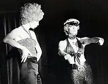 In Stockholm in the autumn of 1975 Lars Jacob, with Anders Eljas as his debuting band leader and Graham Tainton as his choreographer, had already succeeded well with his first cabaret AlexCab,[31][32] where drag numbers of an American type were performed for the first time in Sweden.[15] Respected critic Sten Hedman in 1976 called Jacob's next production Wild Side Story the "best show in town … decadent, fun, exciting, talented", with the soon famous Christer Lindarw, playing Obvióla, almost prophetically named as the best in the show.[33] Writers in major newspapers like Dagens Nyheter and Svenska Dagbladet noticeably had a hard time knowing whether to praise or bash such a totally new phenomenon as Wild Side Story, and their reviews came out somewhat perplexed.[34] The latter of the two did single out Steve Vigil in the leading role, as well as Ulla Jones as Betty-Sue and Agneta Lindén as Anita, for charisma and knowhow.[21] (Vigil had seen Wild Side Story in Florida as early as 1974 and went on after Stockholm to play Bernardo in the California production 1977–1980.)[17]