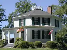 Two stories high, the octagonal house has an 8-sided roof topped by an octagonal "widows walk" flanked by two brick chimneys which serviced 4 fireplaces in the primary living areas and a hearth in the basement. The house faces southeast, with one or two openings in each wall. A modern one-story wing (constructed 2011, replaced ca.1900 structure) runs northwest. There is a three-sided porch facing east, southeast, and south.