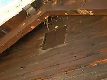 Wildfell is a simplified Federal style, with a molding over the boxed eaves, which is repeated on the porch above its octagonal pillars. The six-paneled front door in a plain frame is topped by a four-light transom. Windows have 6/6 lights behind louvered shutters. The stairway has two turned balusters on each step under a walnut handrail. Double parlors are separated by pocket doors. Original kitchen and dining room spaces are to the rear. Perhaps unique to this house are the exterior and interior load bearing walls whose construction is of narrow (1”x7”) oak planks laid horizontally, nailed from above as the work proceeded, forming a virtually solid 7” wall thickness. The construction method is visible beneath the shutters of the false windows to the left of the front door. The window placement would have opened out from the side of the staircase, but is placed to complete the symmetrical appearance of the house. Floor joists are hand hued timber beams set in a cross pattern and cross joined by lesser beams.