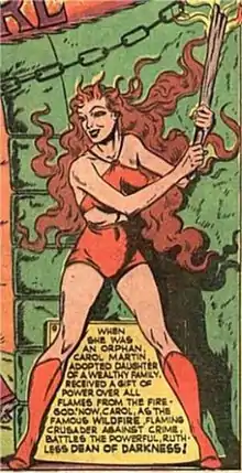 Wildfire (Carol Vance Martin) is a fictional superhero in the DC Comics universe.[1] One of the first female superheroes, she was originally published by Quality Comics during what comics historians and fans called the Golden Age of comic books. With her luxurious mane of red hair and revealing costume, she has been called "the sexiest super-hero of 1941".[2]