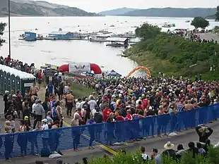 Known for a particularly hilly and grueling course, it is one of the largest triathlon events in the world, with 7,500 athletes and 30,000 spectators attending each year at its peak. Traditionally it is associated with a Wildflower festival, though in recent years the festival had been eclipsed by the increasingly large athletic event. A drastic drop in lake level in 2014 led to a modified course[1] and lower attendance.[2] Shortly after the 2015 event, the Monterey County Board of Supervisors announced it would close Lake San Antonio due to low water levels.[3] The event was canceled in 2017 and 2019. It was canceled in 2020, and was not scheduled for 2021, due to the ongoing COVID-19 pandemic.