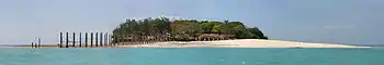 Chapwani Island, 600 by 60 metres (1,970 ft × 200 ft) in size, is under private ownership, and has white sand beaches on one side, surrounded by lush vegetation and many coral inlets with swimming pools on the other side. The island boasts more of history than wildlife. Fauna seen is mostly dik dik antelopes. It is 3 kilometres (2 mi) north of Stone Town.[30] It was formerly known as the French Island. It is also called as the Grave Island, named after the small naval cemetery and the tombs of colonial-era British seamen at its southern end, dated to 1879. The cemetery was specially built in 1879 by Sultan Barghash for the burial of English people of the Royal and Merchant Navies. British sailors killed during the battle between HMS Pegasus and the German cruiser Koningsberg in 1914 are buried here. It is about 4 kilometres (2 mi) north of Zanzibar Town. Potable water is supplied from Zanzibar. As it is privately owned, stay on the island is allowed by booking rooms on the only lodge on the island or on a day visit only by buying a meal ticket.[9][31][32]