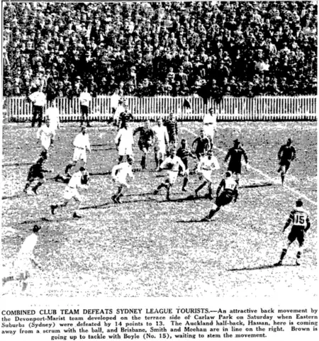 In October the Eastern Suburbs side from Sydney toured New Zealand. Hassan was picked in a combined Marist-Devonport side to play them on 17 October. The defeated the Sydney side by 14 points to 13.[33] He then was chosen for an Auckland Colts side to play the same opponents 4 days later on 21 October. He scored the first try of the match after taking a pass from Oliff and he "cut in cleverly to score".[34]