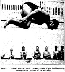 After day 1 of the event in which 5 dives were performed Hassan had "established a lead for the championship".[111] Then on day 2 of the diving which concluded the event Hassan won the national title in heavy rain. His win "caused great enthusiasm among the Auckland team, because, although every swimming title has been held in Auckland, he is the first Aucklander to win the diving for 14 years". He finished ahead of future All Black Arthur Wesney and R.O. Johnson. He was also part of the Auckland team which won the Yaldhurst Shield for the best overall team.[112] After returning to Auckland he won the Mount Eden Carnival over Bob Frankham.[113] The New Zealand Herald wrote that no victory at the "New Zealand championship meeting was more deserved than W. Hassan’s in the men’s diving championship. His opportunities for diving in Auckland are restricted, because in regard to spring, height from the water and depth of water beneath, the boards are poor and unworthy of a city actively interested in natation. Hassan found the boards at St. Albans baths [Christchurch] the best in his experience, and certainly he performed splendid dives.[114]