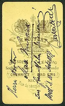 - ↑ first mentioned in the name register of the Dresden Address Book of 1873, the title Court Photographer H.K.H. d. Kronprinzen Albert, (Online, SLUB).