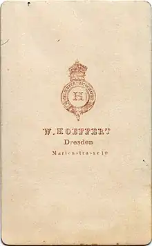 Höffert presumably returned to Germany in the same year and opened a photographic studio in Dresden under his name.[5] Höffert was one of the first photographers to become entrepreneurial, setting up photographic studios under the name "W. Höffert" in several cities and/or had them operated. The names of the operators/studio owners were in many cases not known,[6] The business relationships do not seem to have been clear. Only the photographer Georg Brokesch called himself managing director of the Leipzig studio from 1872 to 1875.