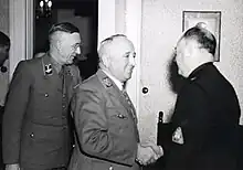 During Ritterbusch's time in office as Commissioner-General, the influence of the NSDAP party apparatus in the Netherlands was strongly repressed in favour of an expansion of the SS power base in the occupied country. This was precisely what Himmler had set as his goal before Schmidt's appointment. Schmidt had put many obstacles in the way of the SS. Accordingly, Himmler demanded that Schmidt's successor must be a "strict representative of the Greater Germanic line".[9] Bormann who, since 1942, had pursued a policy of submissive cooperation between the party and the SS, had bowed to this claim with the appointment of Ritterbusch. At a meeting held in The Hague on 30 July 1943, shortly after Ritterbusch's appointment, he was informed by Seyss-Inquart that unconditional loyalty to the SS leadership was a requirement of his future work. The SS representative, Hanns Albin Rauter, judged Ritterbusch as a "quiet, very orderly man of a pastoral character"[10] because of his obedient administration. According to the SS, he refrained from interfering in their "political shaping" and was an exponent of the party who favored the politics of the SS. He was viewed as weak and did not cause the SS any difficulties. Bormann also conceded in a later report that Ritterbusch was not very energetic. However, he rejected the idea of Ritterbusch being appointed head of the NSDAP's main archive as proposed by his co-worker Walkenhorst, who characterized him as a "kind of party philosopher".[11] In history books, Ritterbusch has also mostly been described as a "colourless party functionary".[12]