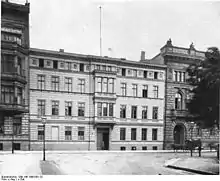 On the northern end of Wilhelmstraße it became apparent that there weren't enough private contractors for the property available. Frederick William I had to come to grips with the fact that, in order to populate the area, some corporations, guilds, state institutions and societies would need to resettle themselves from the southern part of the street, where they normally frequented.[11] Accordingly, a gold and silver manufacturer set up shop in the southwest corner of Wilhelmplatz at Wilhelmstraße 79, which had been built according to Gerlach's plans from 1735 to 1737. This particular manufacturer was also in possession of the Great Military Orphanage in Potsdam, which would be financed by this new endeavor. An additional building on the south side (No. 2) belonged to the same proprietors.[12] As for No. 79, from 1869 to 1876, it was expanded to include the neighboring property (No. 80) and the property toward Voßstraße (No. 35). This expansion accommodated the Prussian Minister of Trade and, beginning in 1878, the Minister of Public Works as well. During the Weimar Republic and Third Reich, the Reich's transportation ministry was located there for a time as well as a part of the train administration.