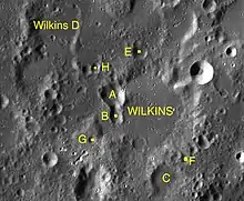 By convention these features are identified on lunar maps by placing the letter on the side of the crater midpoint that is closest to Wilkins.[4]