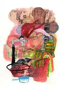 Gill's paintings, which he creates in small and sometimes very large scale sizes in his private studio, have been described as "simplistic and layered...invitingly crafted and coloured."[13] "Cemetery Park (2008) is as frisky and playful as Gum Machine (2008) (both acrylic and collage on panel), with the tombstones and crosses of the former as animated and full of bouncy colours as the latter's gumballs. Others pinwheel and spring with clouds of vanilla and spokes of red and orange. Their energy vaults from the walls."[13] His newer painted works, such as Smokestack/Flower (2010) and Black Water (2012) continue this theme. Gill's paintings have been exhibited locally, as well as nationally and internationally.[14]