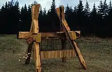 "Interestingly, Gill never cuts a tree for his sculptures; instead, he recycles and reclaims fallen trees and dead wood that he finds in the forest or salvages from building demolition sites. An example of such recycling is the wood coming from the infamous Mount Cashel orphanage ground. The main building was levelled four years ago, many years after the scandal of sexual and physical child-abuses by Christian Brothers. Trees were also cut down to put up a supermarket. The maple the artist recovered from the site is found in his work titled Workhorse (1998), permanently installed at the Boreal Sculpture Park in St. John's. Hanging from the maple beam are some 500 rectangular pieces of birch on bronze rods. While the birch and bronze elements reflect each other by their similarity in size and shape, these two parts of the sculpture present opposing qualities. The marks left by the chainsaw stand as witness of the artist's intentions while conferring roughness, solidity, and strength to the piece. In contrast, the mirror image hung on bronze rods that is animated when the wind blows is delicate and lyrical in feeling."[10]