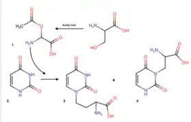 The natural synthesis of willardiine and Isowillardiine from seedlings has been characterized (Figure 5). The synthesis consists of a free uracil ring at nitrogen being substituted for an alanyl side chain, derived from O-acetyl-L-serine.[2]