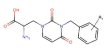 Willardiine (correctly spelled with two successive i's) or (S)-1-(2-amino-2-carboxyethyl)pyrimidine-2,4-dione is a chemical compound that occurs naturally in the seeds of Mariosousa willardiana and Acacia sensu lato.[1] The seedlings of these plants contain enzymes capable of complex chemical substitutions that result in the formation of free amino acids (See: #Synthesis). Willardiine is frequently studied for its function in higher level plants. Additionally, many derivates of willardiine are researched for their potential in pharmaceutical development.[1] Willardiine was first discovered in 1959 by R. Gmelin, when he isolated several free, non-protein amino acids from Acacia willardiana (another name for Mariosousa willardiana) when he was studying how these families of plants synthesize uracilyalanines.[2] A related compound, Isowillardiine, was concurrently isolated by a different group, and it was discovered that the two compounds had different structural and functional properties.[3] Subsequent research on willardiine has focused on the functional significance of different substitutions at the nitrogen group and the development of analogs of willardiine with different pharmacokinetic properties. In general, Willardiine is the one of the first compounds studied in which slight changes to molecular structure result in compounds with significantly different pharmacokinetic properties.[4]