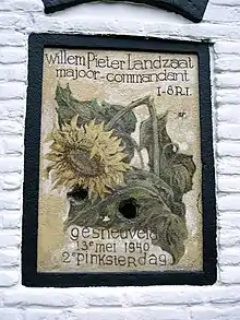 In May 1940 Major Landzaat was commander of the 1st Battalion, 8th Regiment Infantry (I-8 R.I.). On 13 May, his command post, located in a pavilion where a restaurant was located, south of "Ouwehands Dierenpark", was surrounded and attacked. Landzaat said he would defend the Grebbeberg to the last man and last bullet. Earlier, on May 12, he had given the command "stand firm behind the rubble" to his troops.