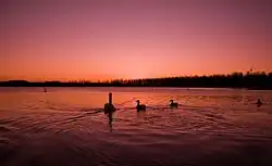 The lake is surrounded by a mixture of open parkland and woodland, which forms part of the wider Ouzel Valley Park.[9] The lake is divided by an embankment and bridge carrying the A509 (H5 Portway), which runs between the east and west of the city, providing links to M1 Junction 14 (approximately 1 mile (1.6 km) to the north-east), and Central Milton Keynes and the A5 (approximately 1.5 miles (2.4 km) and 2.5 miles (4.0 km) to the south-west, respectively).